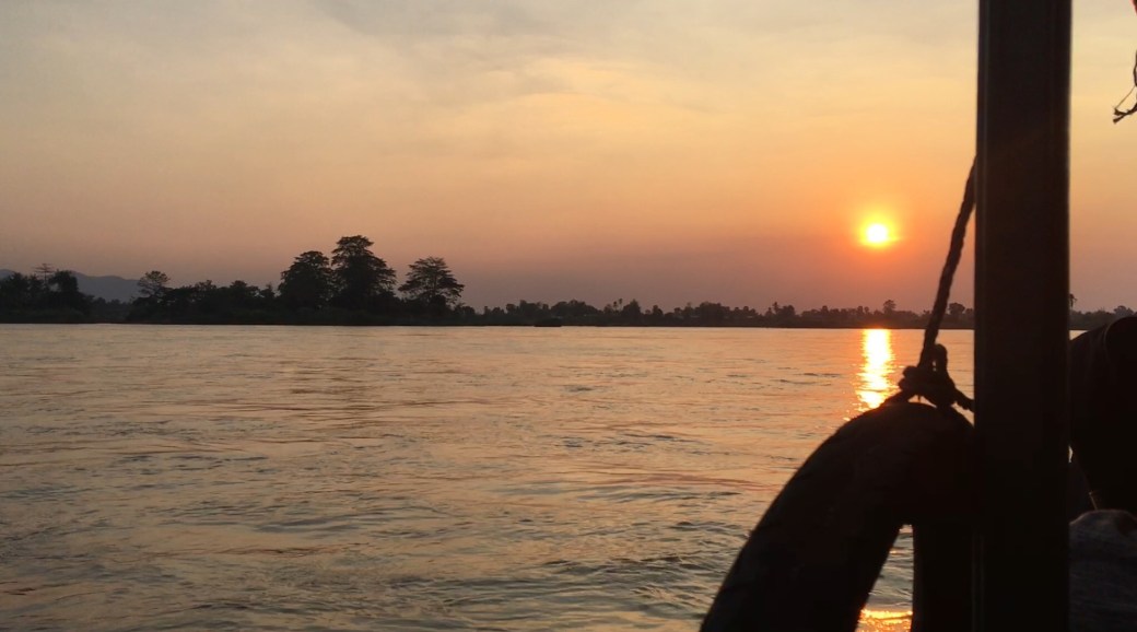 After about two miles, the truck stopped to let off the Pakse-bound, while we turned left and continued to Nakasong, which was plastered on the banks of the Mekong as a jumping-off point to get to 4,000 Islands. A few of this clearly exaggerated number of islands held a collection of tourist outposts, catering to Chinese tourists seeking loud karaoke, retirees seeking luxe days at the river spa, or hippies looking for “happy” pizza, yoga, and cheap beer. Even though yoga was out due to a sprained wrist, we vastly prefer wine to beer, and we don’t eat pizza, happy or otherwise, the promise of a laid back hippie town drew us in.